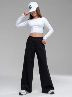 Стильные широкие брюки-палаццо с боковыми карманами из футера черного цвета для девочки. Цельнокроенный пояс на эластичной резинке. Изделие выполнено из