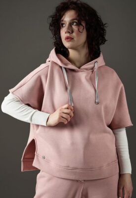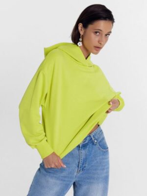 Дизайнерская трендовая толстовка комфортной длины из футера на флисовой основе прямого силуэта с цельнокроеным укороченным рукавом и несъемным капюшоном
