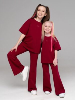 Стильные брюки-клеш из футера ягодного цвета для девочки, облегающие по бедрам и расклешенные от колена. Пояс на эластичной резинке. Изделие выполнено