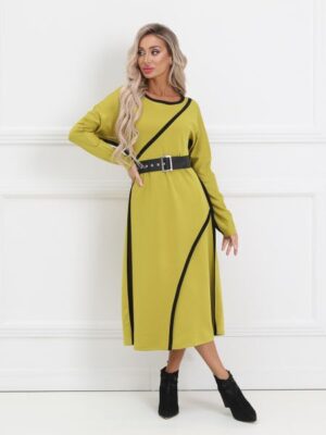 Стильное платье полуприлегающего силуэта из плотного трикотажного полотна лимонного цвета. Круглый вырез изделия обработан широкой окантовкой.