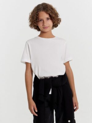 Футболка прямого силуэта. Перед и спинка цельнокроенные. Длина до середины бедра. Рукав втачной, короткий. Горловина круглой формы. Окантована бейкой из