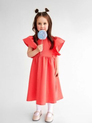 Платье для девочек с декоративными рукавами, горловиной круглой формы, длиной до колена. В составе высококачественный хлопок и лен. По спинке застежка на пуговицу.