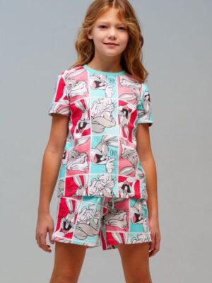 Пижама для девочки подростка. Футболка и шорты из эластичного и приятного на ощупь трикотажа. Шорты на резинке со шнурком. Высокое содержание хлопка 95%.