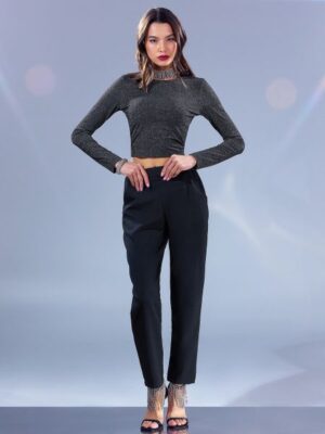 Брюки женские прямого силуэта из ткани. На деталях переда карманы с отрезным бочком. Пояс отрезной состоит из двух частей, задняя часть пояса присборена на резинку.