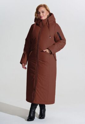 Длинное зимнее пальто приталенного силуэта с центральной застежкой на металлическую, двух замковую молнию. Внутри ветрозащитный клапан. Модель садится