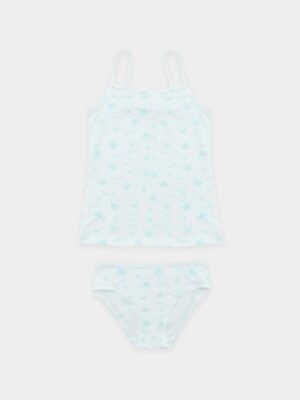 Бельевой комплект для девочек, состоящий из майки и трусиков. Майка свободного силуэта, на бретелях, с небольшим V-образным углублением на горловине и