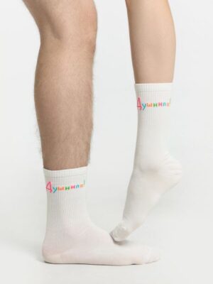 Носок классический гладкий с плотным высоким бортом и рисунком в виде надписи "Душнила". Mark Formelle