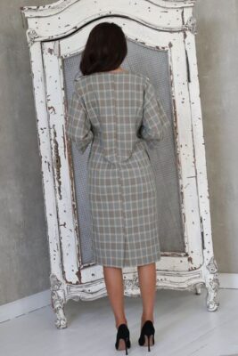 Платье прямое, свободное. С одной стороны линия плеча снижена и сделан разрез от плеча. Платье можно носить с поясом, для этого сбоку предусмотрена шлевка