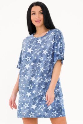Женственное платье полуприлегающего силуэта из текстильго полотна синего цвета. V-образный вырез изделия обработан внутренней обтачкой и украшен отложным воротником.