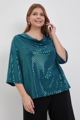 Блузка выполнена из полотна масло с пайетками, воротник качели, рукав 3/4.<br> Длина по спинке/ ширина по груди/ ширина по низу соответственно:<