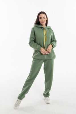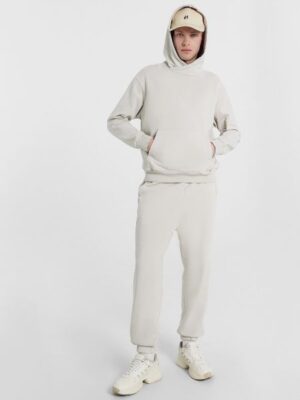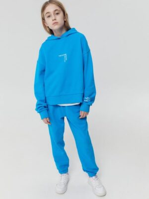 Модель состоит из худи свободного кроя с капюшоном, карманом — кенгуру, рукав — реглан на манжете. Брюки с двумя боковыми карманами, средней