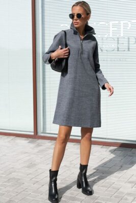 Платье свободного силуэта. Рукав втачной в спущенную пройму. На передней части изделия застежка-молния. Вырез горловины оформлен воротником-стойкой.