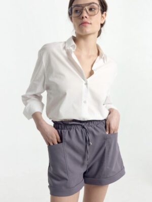 Стильные шорты женские свободного силуэта, чуть расширенного к низу. Выполнены из высококачественного хлопока. Линия талии завышена. Передняя часть мини-шортов