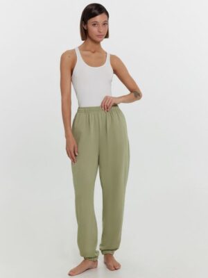 Стильные женские брюки домашние из тонкого футера без подчеса. Объемный силуэт и высокая линия талии гарантируют особый комфорт. Пояс с резинкой внутри