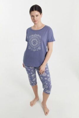 Комфортный пижамный комплект женскийиз высококачественного хлопка. Джемпер прямой и свободный, с круглым вырезом и короткими рукавами. Капри (бриджи) длиной