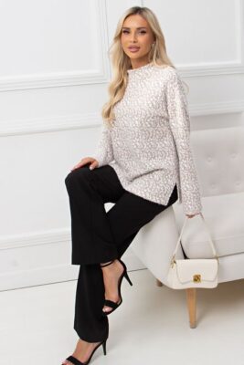 Джемпер из теплого трикотажного полотна свободного кроя. Длинный рукав со спущенным плечом. Воротник стойка. Низ ровный, имеются разрезы в боковых швах.<