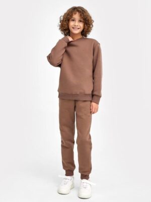 Повседневный комплект для мальчиков, состоящий из свитшота прямого силуэта длиной до середины ягодиц и прямых брюк. Рукава длинные, завершают манжетами, как и штанины.