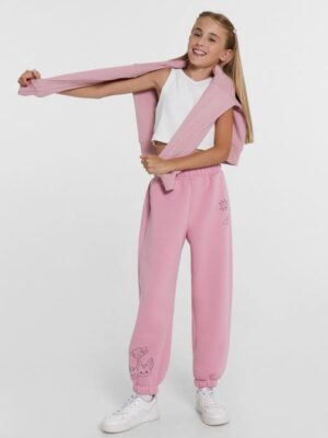 Универсальные брюки детские из высококачественного хлопка. Выполнены брюки для девочки из легкого трикотажного футера. Посадка на талии средняя.
