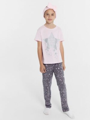Уютная и красивая пижама для девочек. Выполнена из хлопковой трикотажной кулирки. В комплект входят футболка и брюки. Футболка с круглым вырезом, короткими рукавами.