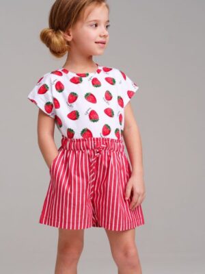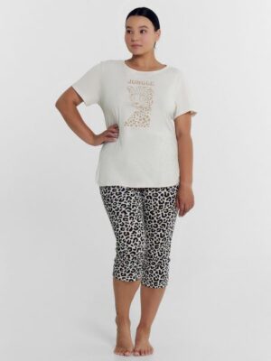 Стильная пижама женская с бриджами (капри) прямого кроя и джемпером с коротким рукавом. Изготовлена из высококачественного хлопка. Модель имеет красивый