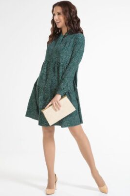 Платье трапециевидного силуэта, отрезное выше линии талии. Нижняя часть переда и спинки из двух воланов, собраных в сборку.Верхняя часть переда с кокеткой.
