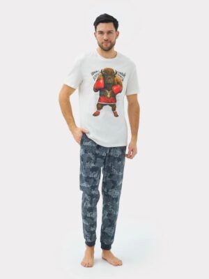 Стильный комплект мужской домашний состоит из футболки и брюк с принтом в виде зубра и надписи "Мужик с бородой — самый крутой"