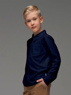 Толстовка а-ля "рубашка" из кулирки темно-синего цвета , с центральной планкой, нагрудным карманом и отложным воротником. Изделие выполнено из