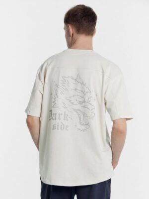 Футболка изготовлена из трикотажного полотна кулирки.Футболка прямого силуэта, оверсайз. Длиной до линии бедер. Рукава втачные короткие 2х шовные.