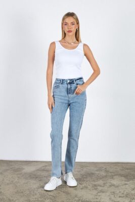 Брюки из эластичного денима, выполнены по классической джинсовой технологии (варка с эффектом легкого выбеливания). Прямой классический крой.