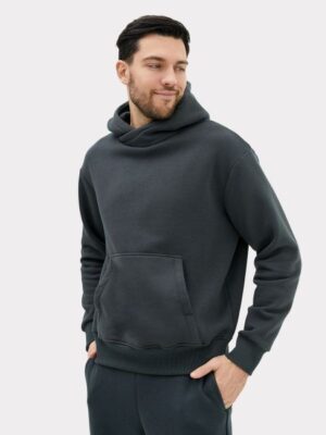 Мужское худи из трикотажного футера с теплым подчесом. Удобный карман-кенгуру, круглая горловина с капюшоном, длинные рукава на манжетах, спущенная линия