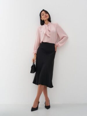 Брюки свободного силуэта расклешенные к низу. Посадка высокая. Пояс цельнокроеный с эластичной тесьмой и шнуром из основного полотна внутри.