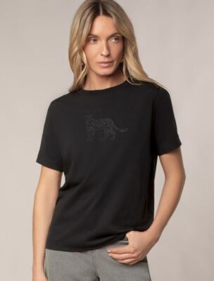 Футболка выполнена из премиального хлопка.Принт "леопард" нанесен фактурными красками с устойчивым покрытием. Наличие эластана в составе гарантирует