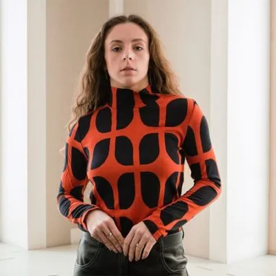 Материал: 84% вискоза EcoVero + 12% переработанный полиэстер + 4% эластан. Облегающий крой. Высокий ворот. Длинные рукава. Сделано в Испании.