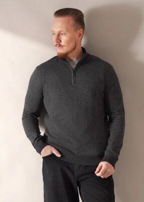 Мужской джемпер с воротником-стойка на короткой молнии. Выполнен из смесовой пряжи с большим содержанием хлопка. Эта стильная модель комфортна и практична