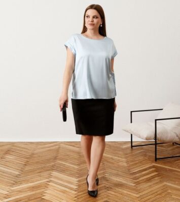 Лаконичная базовая блузка из тонкой струящейся ткани с небольшим блеском. Блузка полуприлегающего силуэта с круглым вырезом горловины, с нагрудными вытачками.