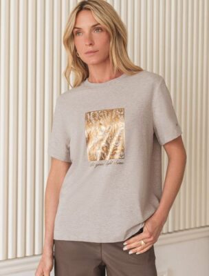 Перевод надписи: let your light shine — сияй.<br> Футболка выполнена из премиального хлопка с эластаном. Эффектный фактурный принт нанесен фольгой