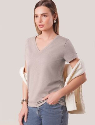 Однотонная футболка с V-образным вырезом выполнена из премиального хлопка. Добавление эластана в состав изделия способствует формоустойчивости.