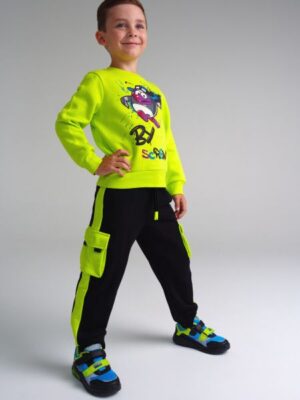 Брюки "Смешарики" из футера с начесом. 100% хлопок. Посадка comfort fit – свободный крой брючин. Карманы в боковых швах. Накладные карманы с клапанами.