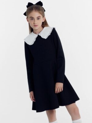 Очаровательное школьное платье полуприлегающего силуэта, длиной выше колена, выполненное в официально-деловом стиле. Перед и спинка платья цельнокроеные