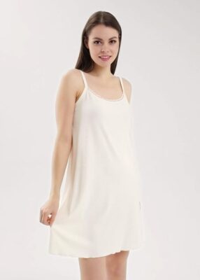 Ночная сорочка из вискозного трикотажного полотна — кашкорсе лапша. Модель А-образного силуэта дополнена узкими бретелями. Спереди по горловине кружево
