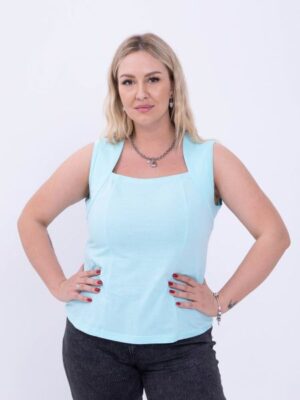 <div>Топ прилегающего силуэта из однотонного трикотажного полотна кулирка. Вырез горловины "карэ". По полочке декоративные элементы.<