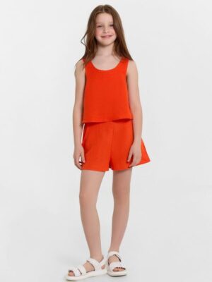 Комплект для девочек, состоящий из топа и шорт, — это легкий и стильный вариант для теплого времени года. Топ А-силуэта с круглым вырезом горловины свободно