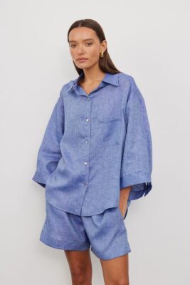Качественная женская рубашка изо льна свободного кроя, оранжевого цвета, с кокеткой на спине, и разрезами по бокам. Рубашка подходит как для офиса, так