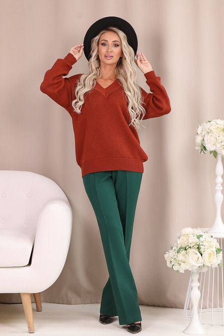 Эффектный джемпер свободного силуэта рыжего цвета. Джемпер выполнен в технике «ручного вязания» из натуральных хлопковых нитей. V-образный вырез изделия обработан двусторонней лицевой бейкой. Низ изделия и втачные рукава обработаны манжетами, выполненные в технике «резинка».<br> Аксессуары в комплект не входят.<br> Длина изделия по спинке от плечевого шва до низа изделия — 66 см.