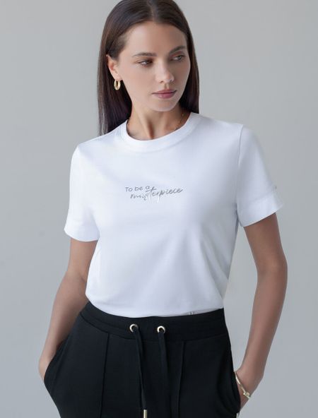 Перевод принта: to be a masterpiece — быть шедевром.<br> Футболка выполнена из премиального хлопка. Авторский принт нанесен фактурными красками с устойчивым покрытием. Наличие эластана в составе гарантирует комфорт и формоустойчивость. Изделие дополнено фирменным металлическим логотипом бренда.