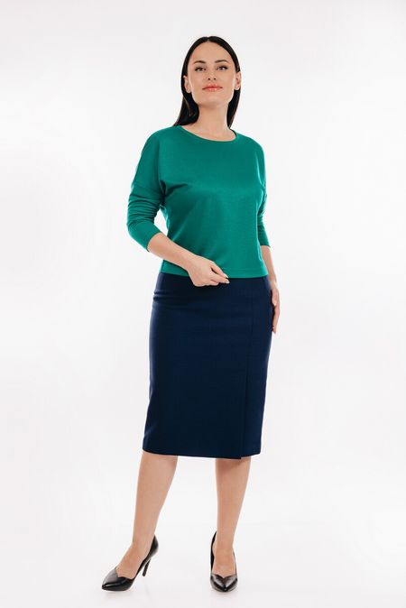 Верхний срез обработан эластичной лентой, дающей дополнительное растяжение. На переднем полотнище шлица. Вытачки на переднем и заднем полотнищах. В центральном шве заднего полотнища потайная застежка и шлица. На подкладке.