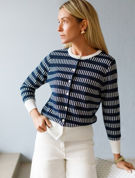 Кардиган тонкой вязки выполнен из вискозы. ВАЖНО! Изделие имеет свои индивидуальные особенности в виде не ритмичного окрашивания белой рибаны. Мягкая пряжа приятно ощущается на теле и дарит настоящий комфорт в теплое время года. Вертикальный вывязанный принт и перламутровые пуговицы поддерживают морской стиль. Добавление в состав ПЭ способствует легкости и износостойкости изделия. Модель дополнена фирменным логотипом бренда.