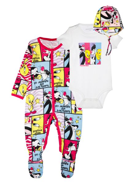 Комплект: боди, комбинезон, шапочка. Боди имеет два ряда кнопок, чтобы расти вместе с малышом. Комбинезон со следочками. Застежка на кнопки. Шапочка с завязками, которые надежно фиксируют изделие на голове.