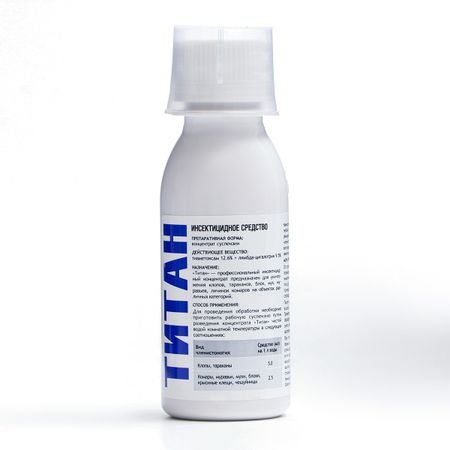 Концентрат от тараканов, клопов и других насекомых "Титан СК", флакон, 100 мл.. "Титан" — представляет собой суспензионный концентрат, который на сегодняшний день является одним из самых эффективных средств для борьбы с насекомыми. Его можно применять в квартире, производственных, жилых помещениях, детских учреждениях, организациях общественного питания и так далее. Перед обработкой: Необходимо провести уборку помещения и исключить доступ к источнику питания. Избегайте слишком запыленных, жирных мест. Для проведения обработки необходимо приготовить рабочую суспензию путем разведения средства «Титан» водой комнатной температуры при равномерном перемешивании в течение 5 минут. Хранить в сухом, прохладном и хорошо вентилируемом помещении, недоступном для детей месте, а так же в удалении от пищевых продуктов, напитков и кормов для животных.