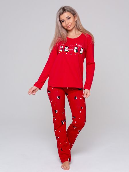 <div>Женский трикотажный домашний костюм, сшит изтонкой трикотажной ткани — кулирки, что делает его максимально комфортным для тела. Можно использовать как домашний костюм, так и в качестве пижамы. Футболка с длинным рукавом декорирована принтом. Брюки прямые, облегающего силуэта, с высокой посадкой, без карманов. Рисунок на брюках может смещаться. Уютная пижама — отличным подарком на зимние праздники для ваших близких. Состав хлопок 100%. Длина по спинке 61-70 см, длина брюк 100-105 см, длина рукава 57-65 см. Рекомендации по уходу : бережная стирка при 30 градусах</div>